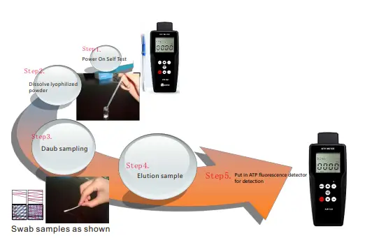 Gunakan tongkat uji (swab) untuk mengambil sampel dari permukaan yang ingin diuji. Masukkan swab ke dalam instrumen dan tunggu hasilnya muncul pada layar LCD. - Interpretasi Hasil