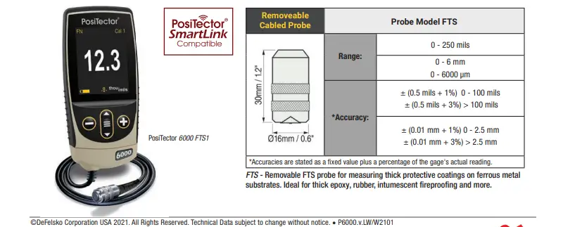 Alat Pengukur Ketebalan Lapisan Rubber Positector 6000 Coating Thickness Gauge FTS1 DEFELSKO dilengkapi dengan probe model FTS1 yang dapat dilepas. Berikut adalah spesifikasi utama alat ini: