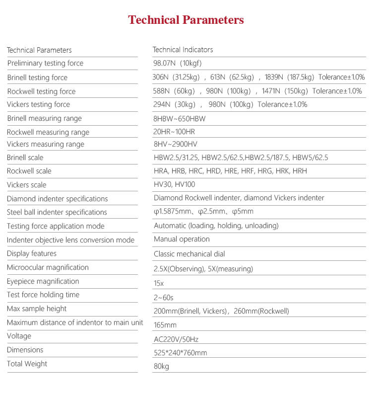 - Gaya Uji Vickers: 294N (30kg), 980N (100kg) – Toleransi ±1.0%.