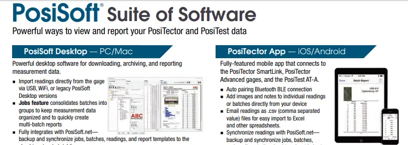 - Berbagai opsi perangkat lunak, termasuk PosiSoft Desktop untuk PC/Mac, PosiSoft USB Drive untuk akses cepat ke data, dan aplikasi mobile PosiTector untuk iOS/Android, memberikan solusi lengkap untuk pengunduhan, arsip, dan pelaporan data pengukuran.