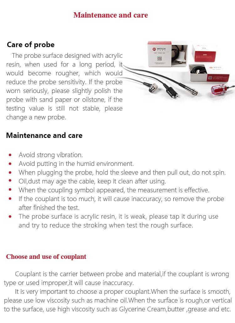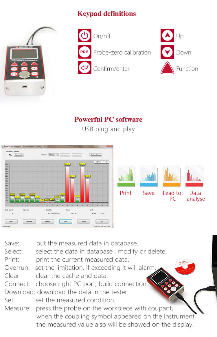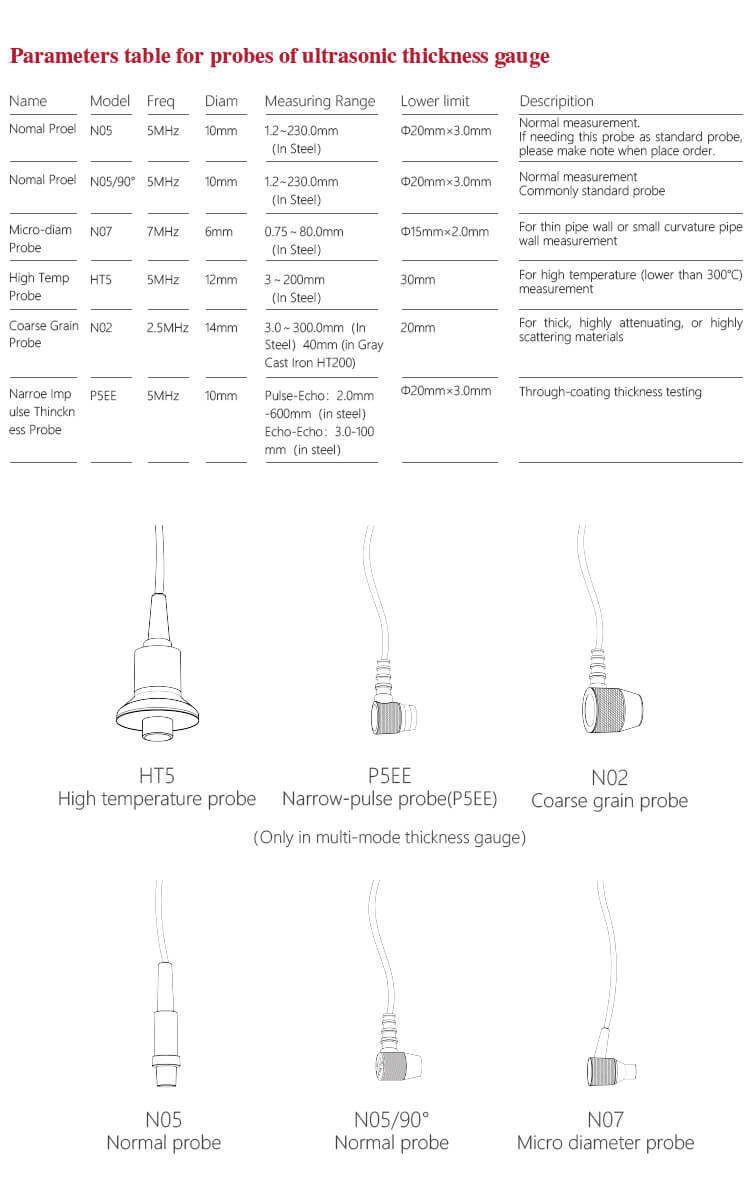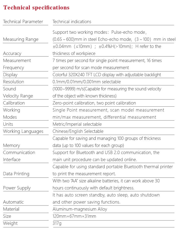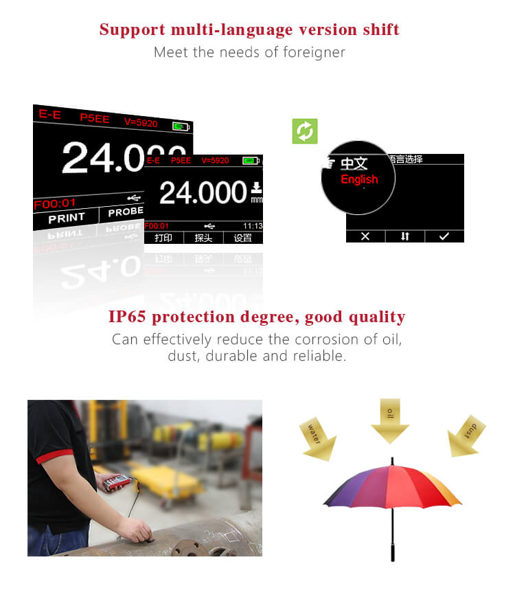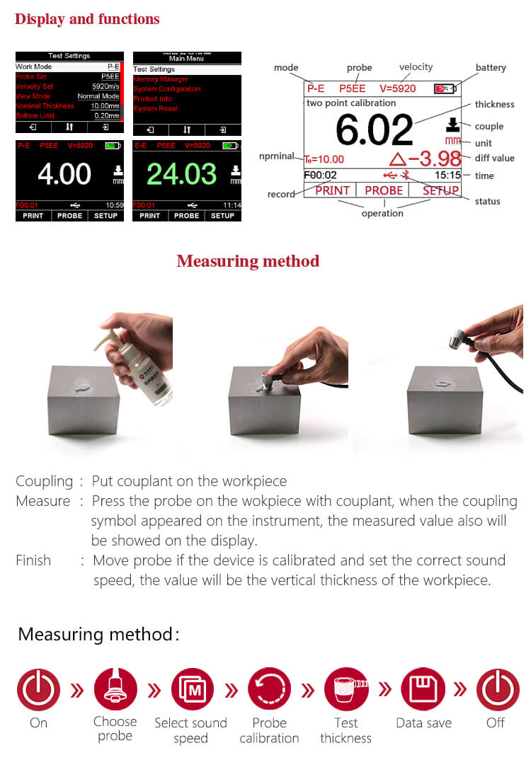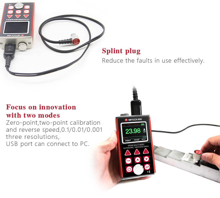 - Multi-mode: Mode Pulse-Echo (P-E) dan Mode Echo-Echo (E-E). Dalam Mode Echo-Echo, dapat menguji ketebalan dinding menghilangkan ketebalan cat atau pelapis.