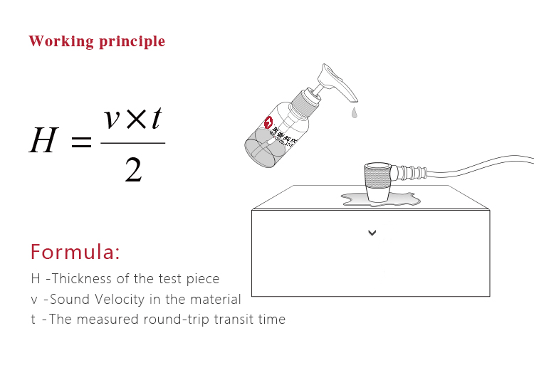 - Prinsip Kerja Gauge ketebalan ultrasonik digital menentukan ketebalan suatu bagian atau struktur dengan mengukur dengan akurat waktu yang dibutuhkan untuk pulsa ultrasonik pendek yang dihasilkan oleh transduser untuk melakukan perjalanan melalui ketebalan material, pantulkan dari bagian belakang atau permukaan dalam, dan kembali ke transduser. Waktu transit dua arah yang diukur dibagi dua untuk memperhitungkan jalur perjalanan ke bawah dan kembali, lalu dikalikan dengan kecepatan suara dalam materi. Hasilnya diungkapkan dalam hubungan terkenal: H = v × t/2
