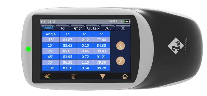 Alat Ukur Warna 6 Multi Sudut -15°, 15°, 25°, 45°, 75° & 110° Spektrofotometer MS3006 3NH mengusung teknologi terdepan dengan mengadopsi MCU (Unit Pemrosesan Sentral) kelas industri dan 6 sudut pengukuran, menyajikan kemampuan presisi dalam mengukur warna untuk produk dengan efek warna kompleks seperti logam dan mutiara. Sistem operasi yang mulus dan kinerja unggul sistem optik memungkinkan MS3006 memberikan tingkat ketepatan dan reproduktibilitas yang tinggi dalam pengukuran Sparkle Grade (SG), Diffuse Coarseness (DC), dan Color Variation (CV).