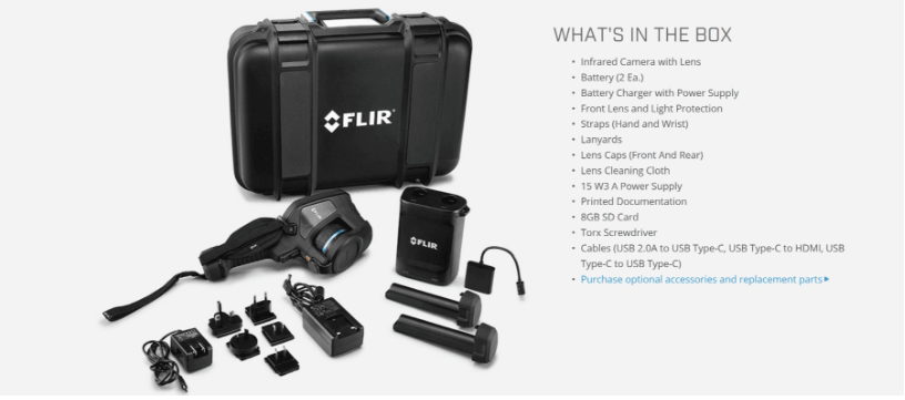 Kemasan Kamera inframerah dengan lensa, eyecup pandangan kecil, 2 baterai, pengisi daya baterai, koper transportasi keras, tali, penutup lensa depan, catu daya, dokumentasi cetak, kartu SD (8 GB), kabel (USB 2.0 A ke USB Type-C, USB Type-C ke HDMI, USB Type-C ke USB Type-C), Kartu Lisensi: FLIR Thermal Studio Starter