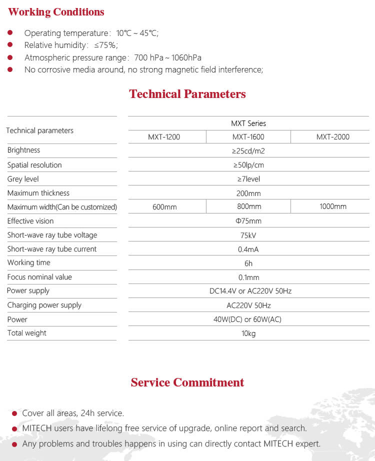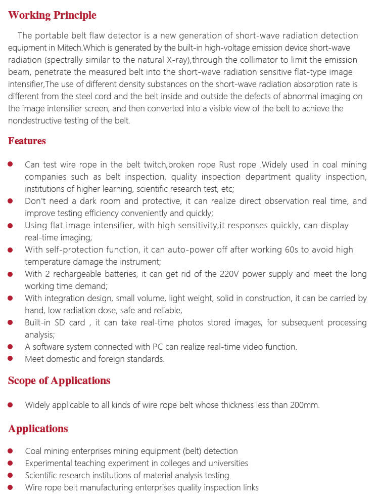 Pendetektor cacat belt portabel adalah peralatan deteksi radiasi gelombang pendek generasi baru di Mitech. Alat ini menghasilkan radiasi gelombang pendek (dengan spektrum yang mirip dengan sinar-X alami) melalui perangkat emisi tegangan tinggi yang dibangun di dalamnya. Radiasi ini dibatasi oleh kolimator untuk mengarahkan sinar emisi ke belt yang diukur. Kemudian, sinar tersebut menembus belt yang diukur ke dalam intensifier gambar tipe datar yang peka terhadap radiasi gelombang pendek. Berbagai zat dengan densitas yang berbeda akan mengabsorpsi radiasi gelombang pendek ini dengan tingkat yang berbeda, dan hasilnya adalah gambaran abnormal dari tali kawat dan cacat di dalam dan di luar belt yang ditampilkan di layar intensifier gambar. Kemudian, gambar tersebut dikonversi menjadi tampilan yang dapat dilihat untuk menguji belt tanpa merusaknya.