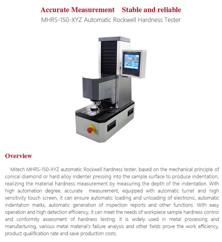 Rockwell Hardness Tester Mitech MHRS-150-XYZ Automatic adalah alat uji kekerasan Rockwell otomatis yang mendasarkan prinsip kerjanya pada indenter berlian kerucut atau indenter paduan keras yang menekan permukaan sampel untuk menghasilkan lekukan, sehingga mengukur tingkat kekerasan material dengan mengukur kedalaman lekukan. Dengan tingkat otomatisasi yang tinggi, akurasi pengukuran yang tinggi, dilengkapi dengan turret otomatis dan layar sentuh sensitif yang responsif.