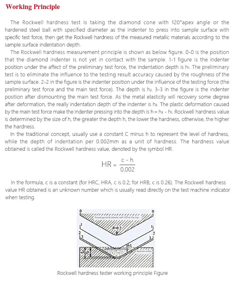 Pengujian kekerasan Rockwell menggunakan indenter berlian kerucut dengan sudut puncak 120° atau bola baja yang sudah keras dengan diameter tertentu untuk menekan permukaan sampel dengan gaya uji tertentu. Selanjutnya, alat ini mengukur tingkat kekerasan Rockwell dari material logam yang diukur berdasarkan kedalaman lekukan pada permukaan sampel.