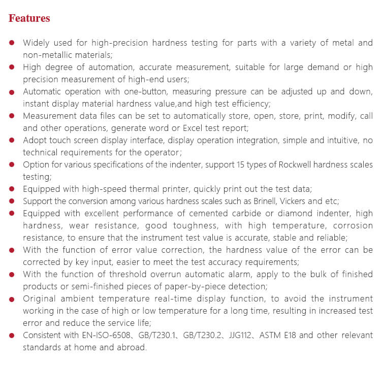 - Sesuai dengan standar EN-ISO-6508, GB/T230.1, GB/T230.2, JJG112, ASTM E18, dan standar terkait lainnya di dalam dan luar negeri.
