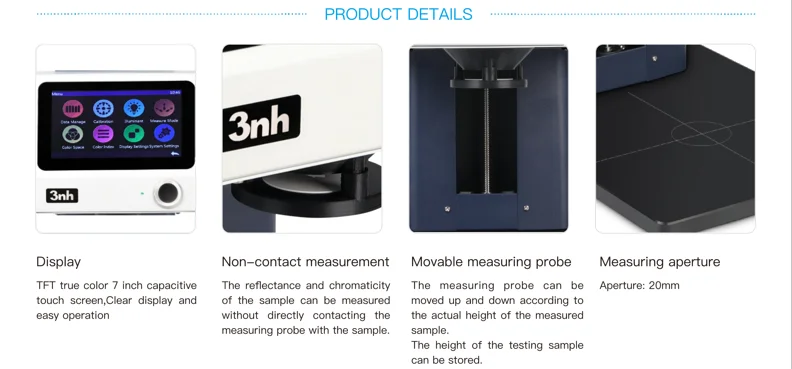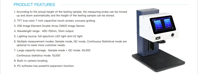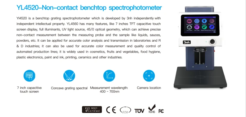 Spektrofotometer Benchtop Non-Kontak Geometri Optik 45/0 YL4520 3nH dengan geometri optik 45/0 (45 pencahayaan berbentuk cincin, pandangan vertikal), yang dirancang untuk mencapai pengukuran non-kontak yang tepat antara probe pengukur dan sampel seperti cairan, saus, bubuk, dll. Perangkat ini dikembangkan secara independen oleh 3nh dengan hak kekayaan intelektual independen.