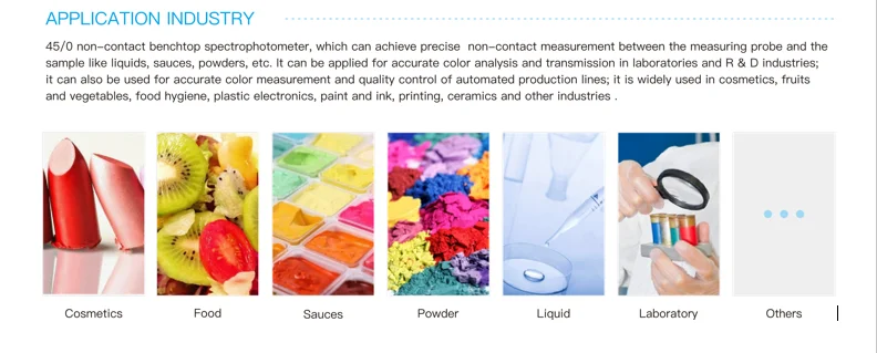 - Fitur: Spektrofotometer benchtop non-kontak 45/0 dapat mencapai pengukuran non-kontak yang tepat antara probe pengukur dan sampel seperti cairan, saus, bubuk, dll. Dapat digunakan untuk analisis warna dan transmisi yang akurat di laboratorium dan industri penelitian dan pengembangan (R&D); juga dapat digunakan untuk pengukuran warna dan kontrol kualitas di jalur produksi otomatis. Digunakan secara luas di berbagai industri seperti kosmetik, buah dan sayuran, kebersihan makanan, elektronik plastik, cat dan tinta, percetakan, keramik, dan industri lainnya.