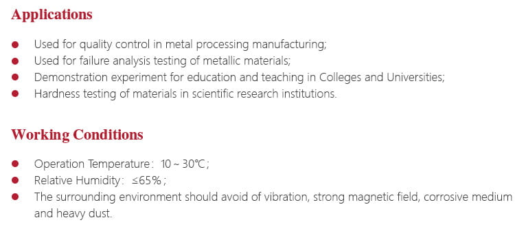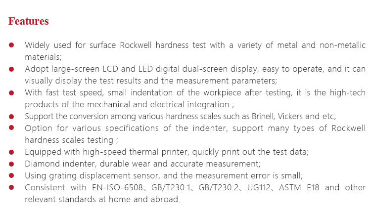 - Sesuai dengan standar EN-ISO-6508, GB/T230.1, GB/T230.2, JJG112, ASTM E18, dan standar relevan lainnya di dalam dan luar negeri.