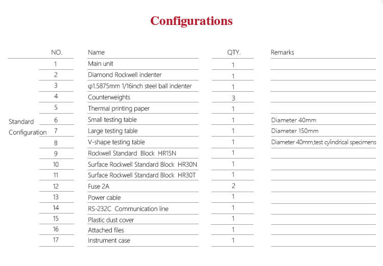 - Pilihan untuk berbagai spesifikasi indenter, mendukung banyak jenis pengujian kekerasan Rockwell.